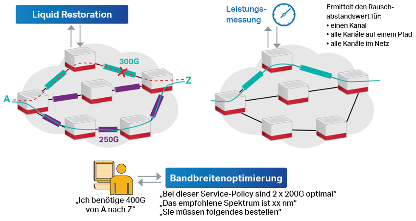 - New Liquid Spectrum Software-Applikationen, mit denen Betreiber die Nutzung ihrer Netze optimieren können. Die jetzt angekündigten Applikationen bieten Einblicke in die Netzleistung in Echtzeit, die eine proaktive Systemoptimierung ermöglichen (Performance Meter), sie erlauben eine viel einfachere und schnellere Anpassung von Wellenlängen (Bandwidth Optimizer), verbessern die Serviceverfügbarkeit (Liquid Restoration) und unterstützen eine automatisierte Servicebereitstellung in Multi-Vendor-Netzen (Wave-Line Synchronizer).